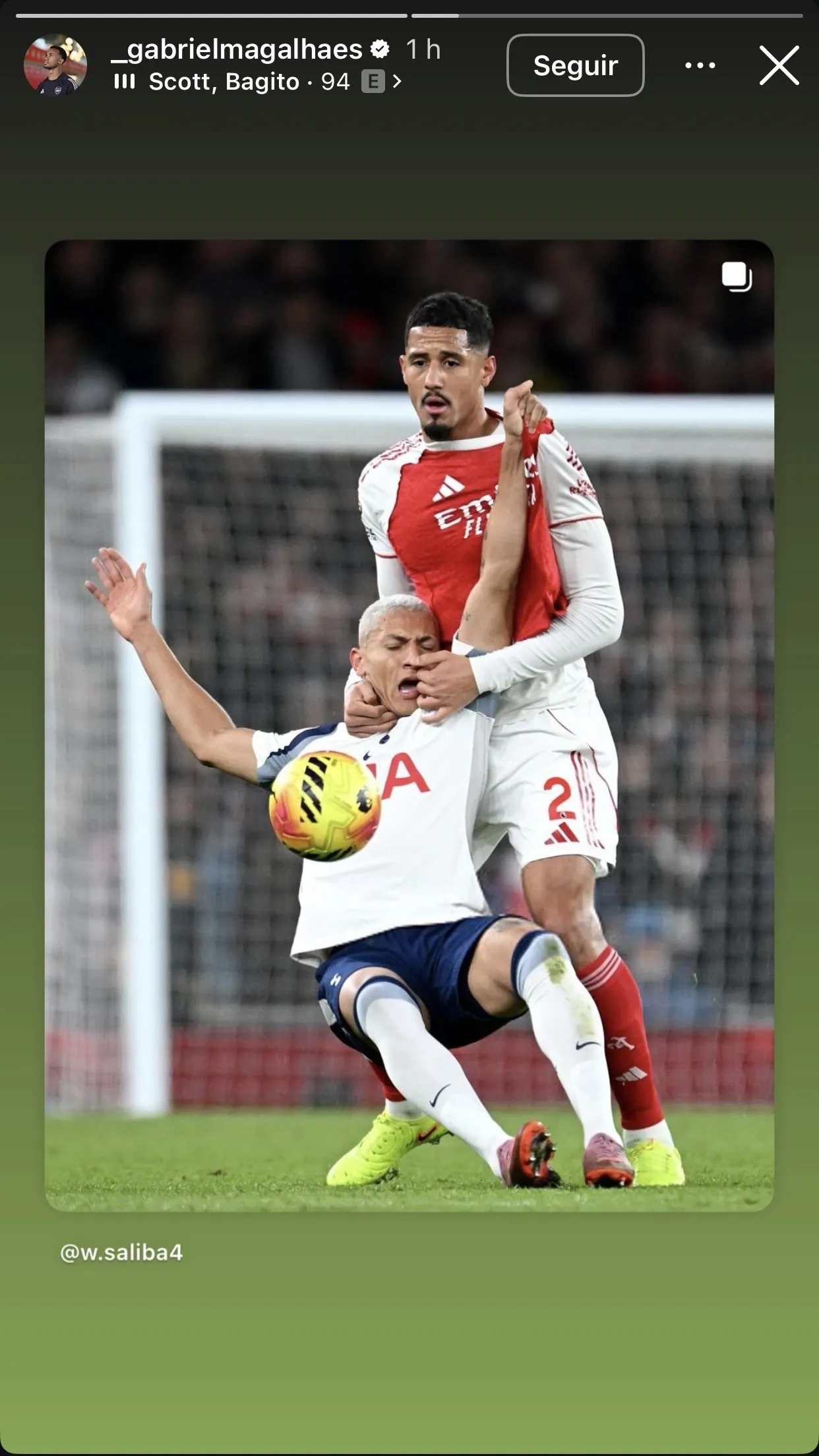 Apesar de não ter participado da partida por estar machucado, o zagueiro brasileiro Gabriel Magalhães, ídolo dos Gunners, aproveitou o clima de rivalidade para brincar nas redes sociais. Após o jogo, postou no Instagram uma foto com seu troféu de Melhor em Campo (MOTM) de uma partida anterior, marcando Richarlison com os seguintes emojis de 😮💨🤷🏽♂️.