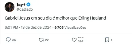 Gabriel Jesus marca três gols nesta quarta (18), contra o Crystal Palace. Fanáticos comentaram sobre a partida do atacate. Foto: IMAGO / Sportsphoto