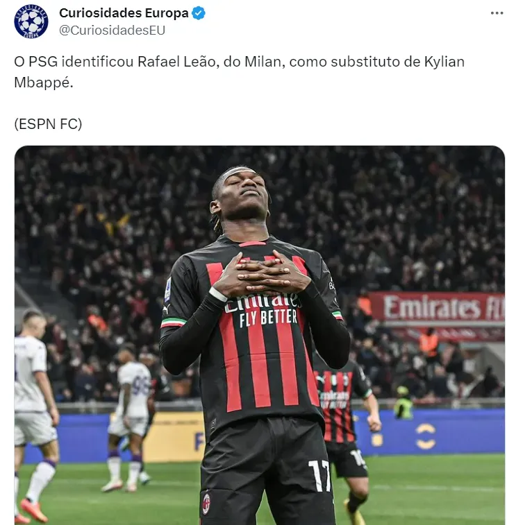 De acordo com informações da ESPN Internacional, o PSG definiu que Rafael Leão, do Milan, é o substituto ideal de Mbappé e fará de tudo para tirá-lo do Milan no final da temporada.