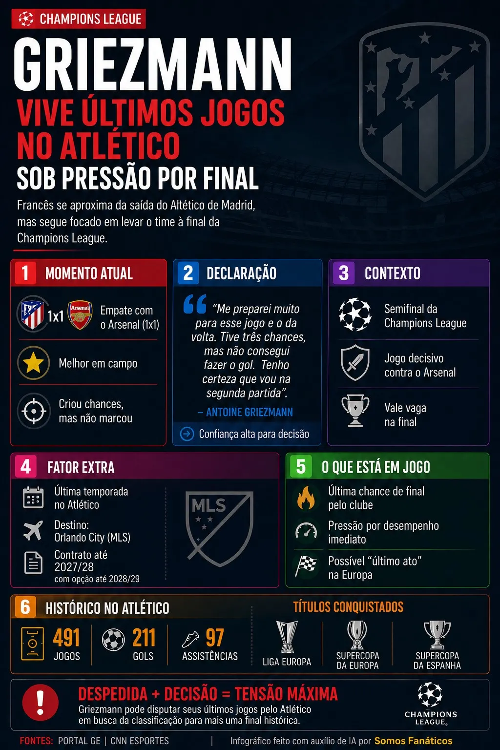 Segundo o portal GE, em sua última temporada pelo time madrilenho, Griezmann tentará voltar à final da Liga dos Campeões uma década depois do vice para o Real em 2016 e mira gol contra os Gunners.