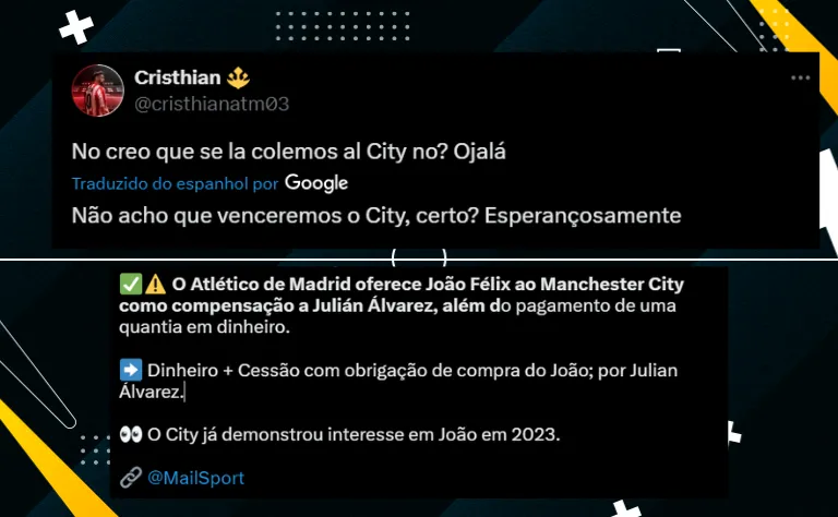 Ciente de que Félix deseja sair, o Atlético Madrid lhe ofereceu ao Manchester City por uma troca envolvendo Julian Álvarez. Além disso, foi oficializado uma compensação financeira. A informação é do Mail Sport.