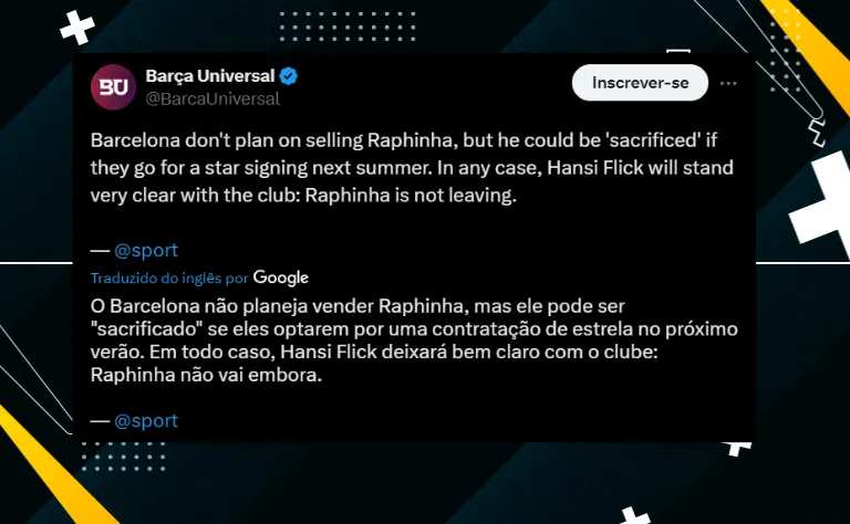 Com contrato em vigor até a temporada de 2027, Raphinha soma 98 jogos com as cores do Barcelona, com 26 gols anotados e 31 assistências realizadas. O brasileiro é jogador culé desde 2022.