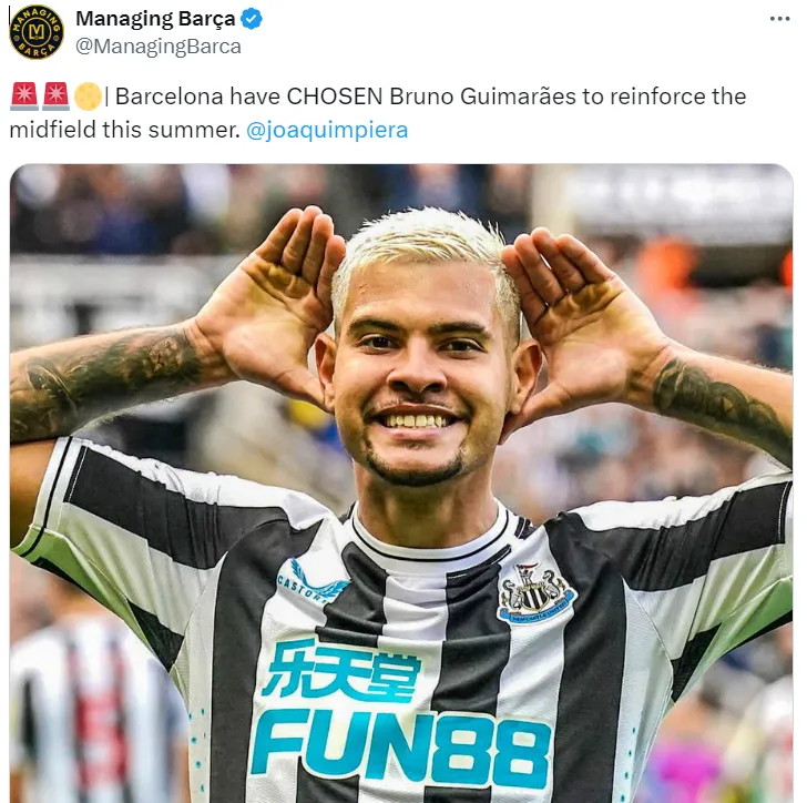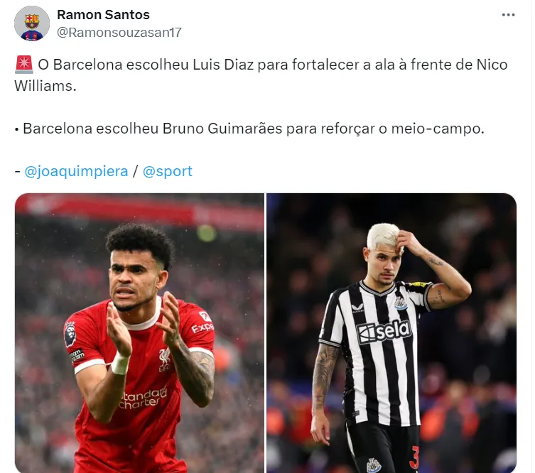 Os jogadores, de acordo com informações do jornal Sport, são Luis Díaz, do Liverpool, e o brasileiro Bruno Guimarães, do Newcastle e da Seleção Brasileira. Eles são as prioridades totais de Deco e Laporta.