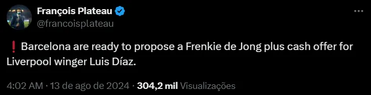 O Barcelona está muito interessado no futebol de Luis Díaz, de 27 anos de idade, considerado um dos principais jogadores do Liverpool. Segundo François Plateau, os espanhóis preparam uma grande oferta por ele.