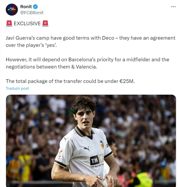 O Barcelona tem o sinal positivo do meio-campista Javi Guerra, do Valencia, e um acordo está nas mãos de Laporta e Deco. A informação é de Ronit, perfil voltado ao clube catalão no X.