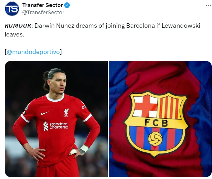 Na Espanha, em meio aos rumores de uma saída da Inglaterra, o Mundo Deportivo revelou que o grande sonho de Darwin Núñez é jogar com as cores do Barcelona, e revelou o que poderia ser feito para um acordo.