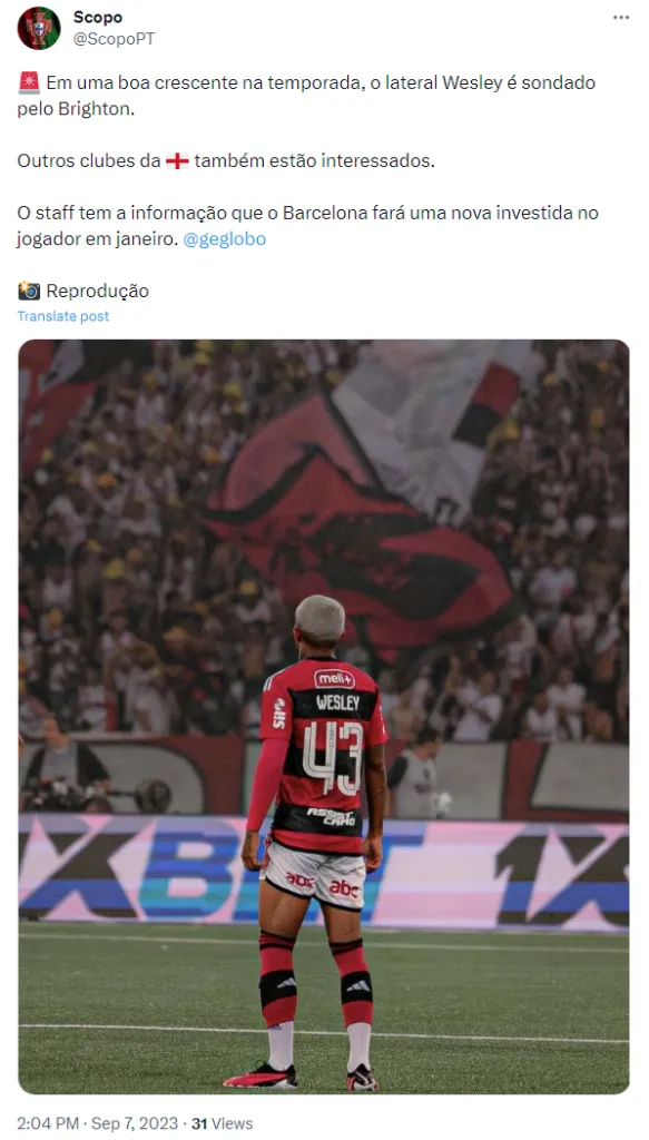 Na atual temporada, pelo Flamengo, Wesley já fez 41 jogos, com dois gols e uma assistência. Além disso, o contrato do jogador vai até 2025.