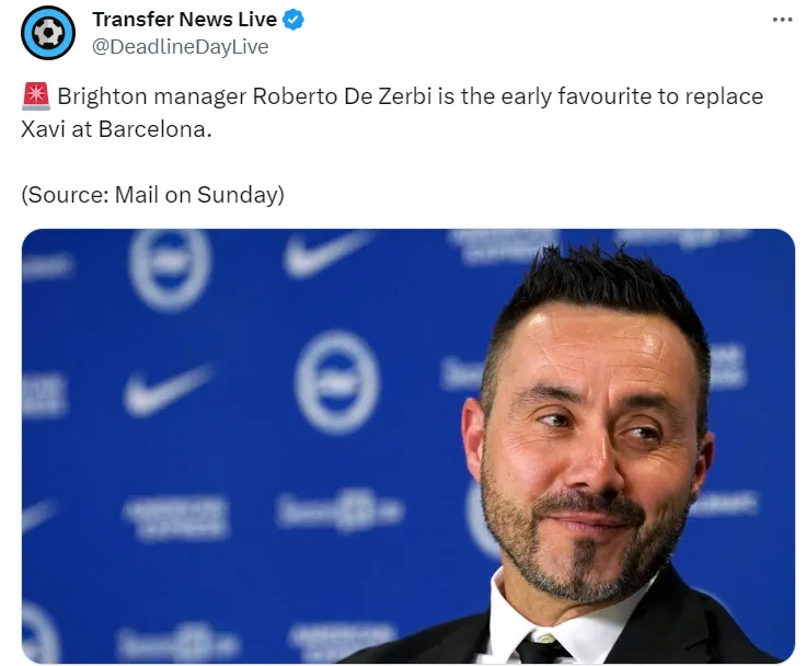 A informação é passada pela imprensa espanhola (SportXtra TV), que frisa que o nome de De Zerbi ganha força para assumir o Barcelona em meio a recomendação de Guardiola.