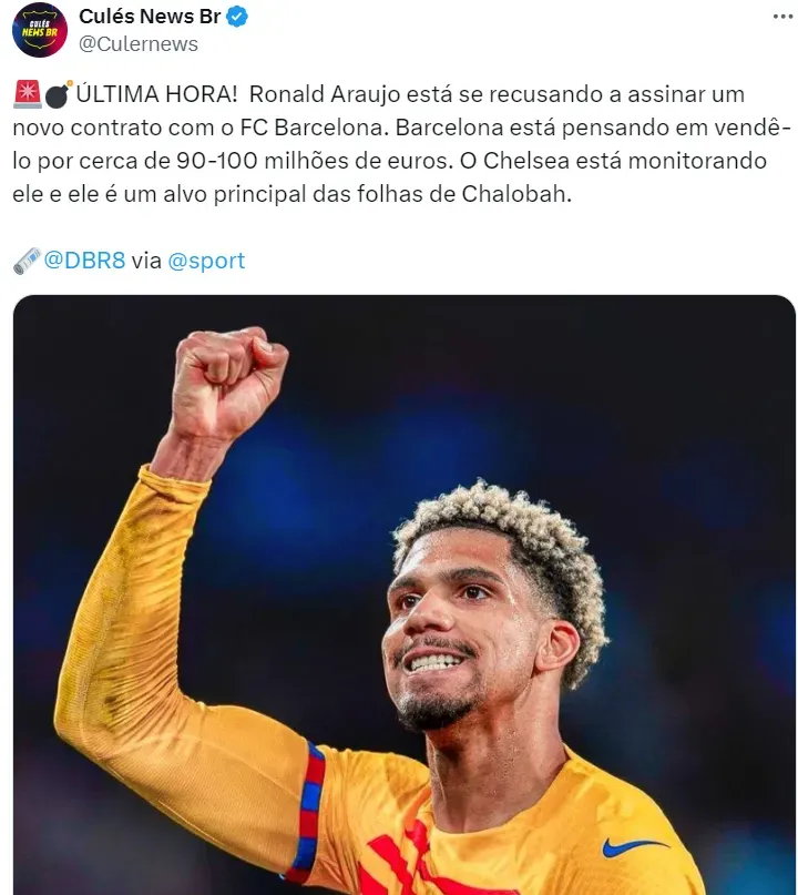 A decisão de momento do defensor faz com que o Barcelona passe a considerar ofertas por ele, com o Chelsea monitorando e sendo o principal possível destino de Araújo para a próxima temporada.