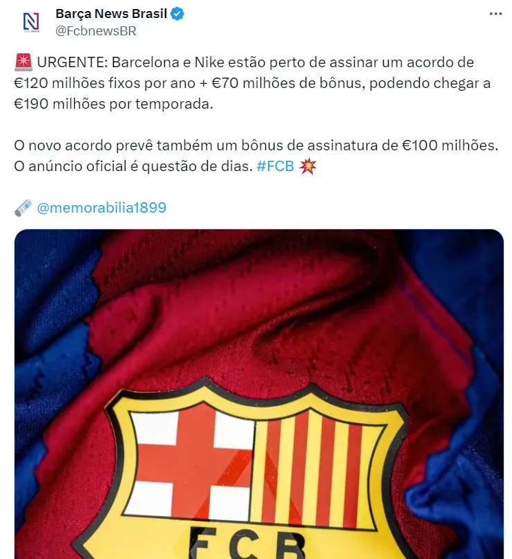 Esse novo acordo entre Barcelona e a empresa americana vai fazer com que o clube Catalão passe a ter o maior patrocínio do mercado, superando o Real Madrid e Manchester United, com a Adidas, e Liverpool e PSG, com a Nike, informa o Mundo Deportivo.