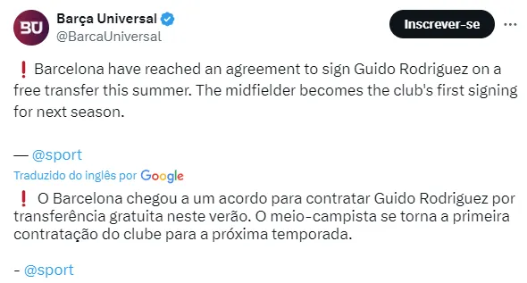 O Barcelona fechou a primeira contratação para a próxima temporada do futebol europeu. A informação foi publicada pelo jornal Sport, um dos principais da Espanha.