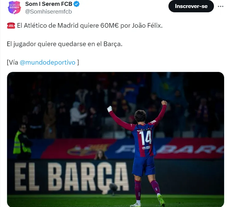 João Félix deseja ficar no Barcelona para a próxima temporada, o clube catalão tem interesse no português, mas um acordo pode ir de mal a pior devido à pedida de 60 milhões de euros do Atlético Madrid para liberá-lo ao rival.