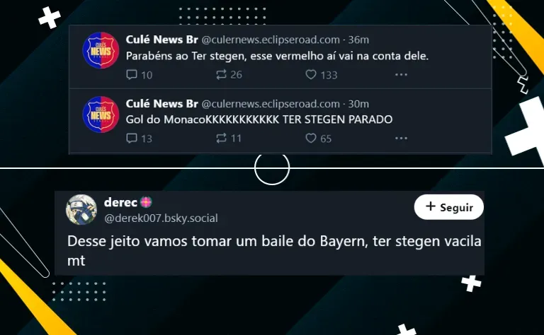 “Quando o assunto é Champions League, se esse cara é tema da conversa, coisa boa não é”, publica um perfil voltado ao clube espanhol, sobre Ter Stegen. Parte dos torcedores entendem que ele teve culpa na expulsão de García.