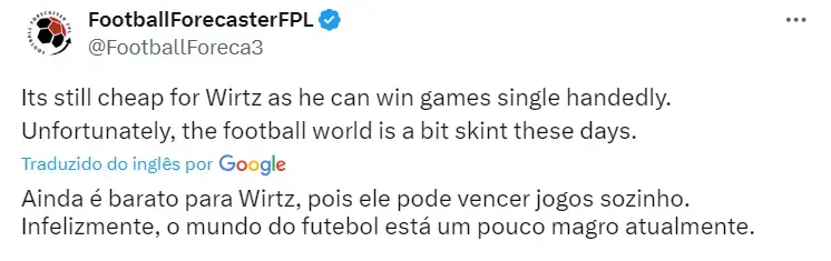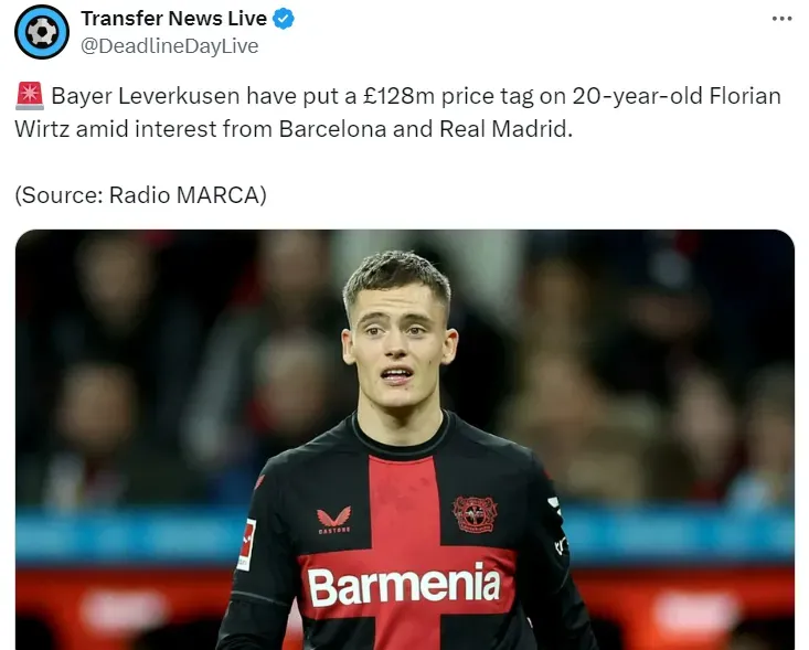 Ciente dos interessados e com planos para Wirtz, visando a Champions League da próxima temporada, o Bayer definiu o preço para negociar o jovem jogador no mercado: 128 milhões de libras (R$ 835 milhões).