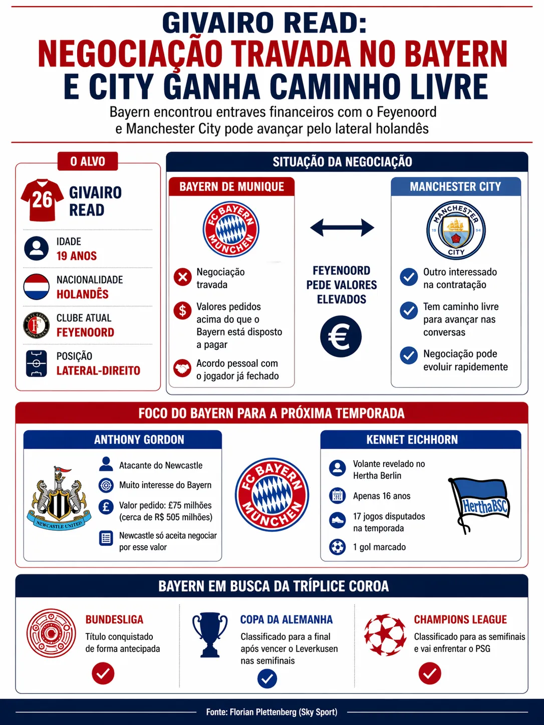 De acordo com o jornalista Florian Plettenberg, da Sky Sport, o time holandês está exigindo valores acima do que o clube da Bavária está disposto a pagar. Por isso, o Manchester City, outro interessado, tem caminho livre para avançar na negociação.