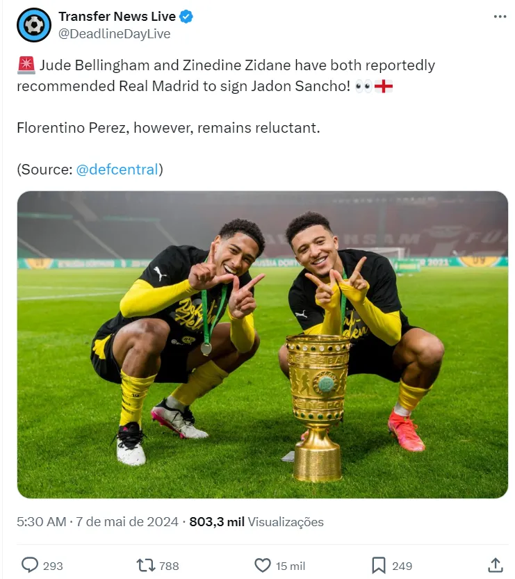 Bellingham e Zidane teriam recomendado a contratação de Sancho para o Real Madrid. As boas atuações do inglês pesam para que os dois nomes peçam a Florentino a contratação. Zidane não faz mais parte do clube merengue, mas tem voz ativa na diretoria.