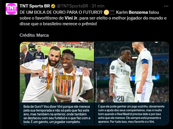 Karim não faz questão de esconder que Vini Jr é o favorito dele para ganhar a premiação. Nomes como Bellingham e Kroos, por exemplo, não fizeram uma grande Eurocopa e isso pesa.