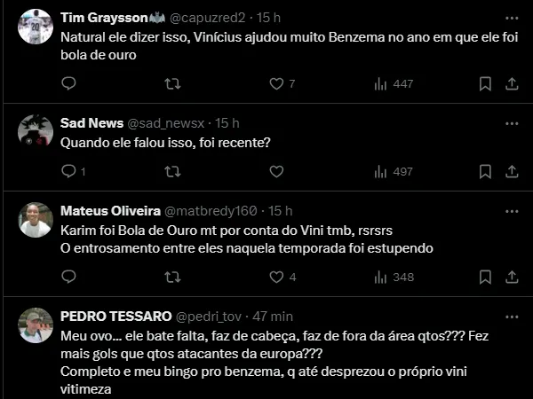 Sobre o brasileiro, o francês acredita que Vinícius “é um garoto, um jogador completo”. O camisa 7 do Real ganhou o coração até de quem parecia jogar contra no início, em Madri.