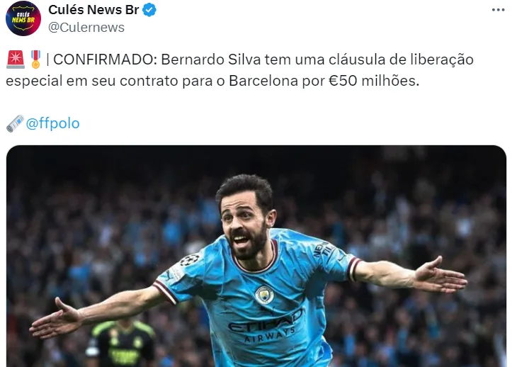 De acordo com Fernando Polo, Bernardo Silva tem uma cláusula de liberação avaliada em 50 milhões de euros para jogar no Barcelona. Essa condição está presente no contrato do atleta com o City e, caso do clube espanhol topar desembolsar essa quantia, as chances de um acordo serão grande.
