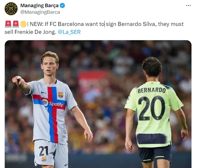 A venda de De Jong geraria uma receita milionária para o Barcelona trazer Bernardo Silva ao Camp Nou. Assim, a multa de 50 milhões de euros do atleta seria paga, junto ao Man City.