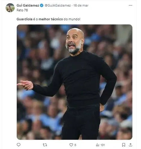 “Para mim, receber elogios de um treinador como Guardiola é algo espetacular, porque, como disse, estamos falando de um treinador que aprecio muito e que, para mim, hoje, é o melhor treinador do mundo“, afirmmou.