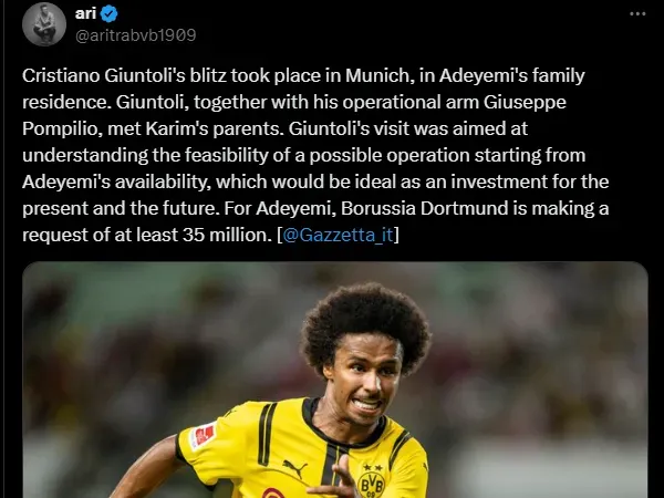 A dupla encontrou com Adeyemi para entender se ele tem vontade de deixar a Bundesliga rumo a um desafio inédito na Série A. O time da Juve está de portas abertas para recebê-lo.