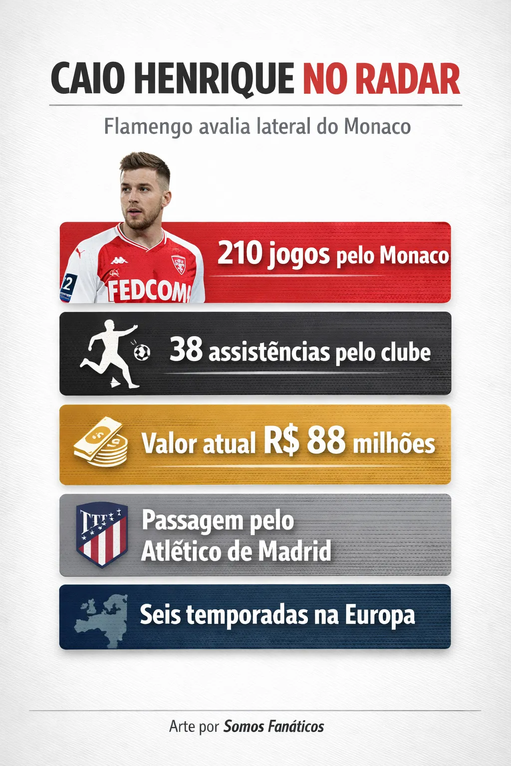 Caio Henrique, lateral-esquerdo do Mônaco, da França, entrou no radar do Flamengo, por mais que o acordo seja difícil, já que o jogador possui mercado no futebol europeu. Abaixo, Somos fanáticos traz a carreira do jogador e seu desempenho no futebol europeu defendendo o time francês e o Atlético de Madrid, segundo Ogol.