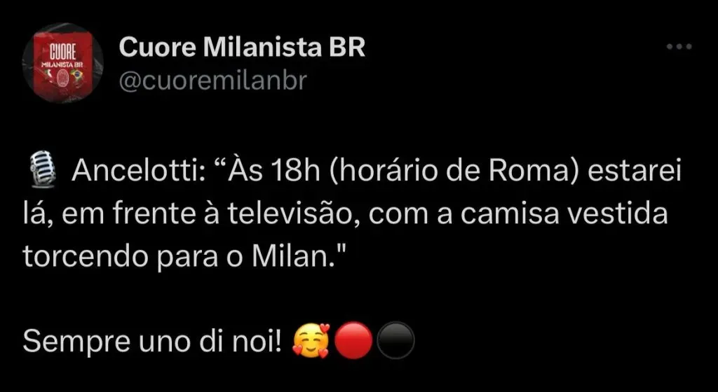 “Às 18h (horário de Roma) estarei lá, em frente à televisão, com a camisa vestida torcendo para o Milan.” afirmou Carlo Ancelotti.