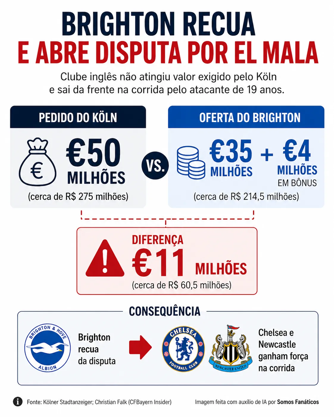 O Brighton recuou nas negociações por Said El Mala após não atingir €50 milhões, cerca de R$ 275 milhões, valor exigido pelo Köln. O clube inglês, que era considerado líder na disputa pelo atacante, mudou o cenário e abriu espaço para os rivais interessados, conforme o jornal Kölner Stadtanzeiger.