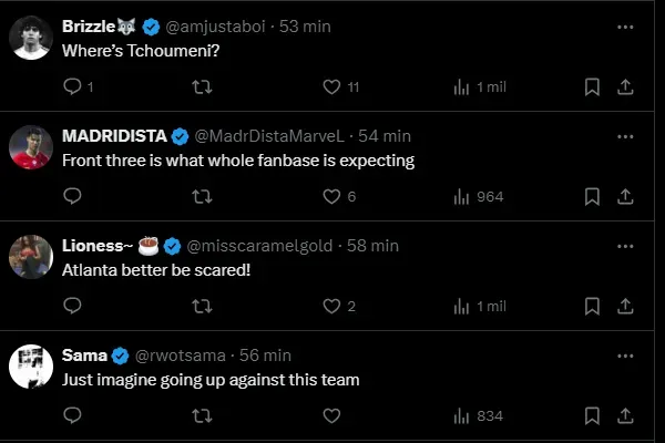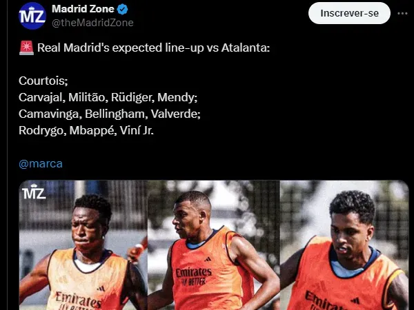 Vinícius Júnior está no time titular ao lado de Mbappé e Rodrygo. Endrick neste caso fica barrado, assim como Arda Güller e Brahim Díaz. Os três jogaram juntos na pré-temporada e são alternativas.