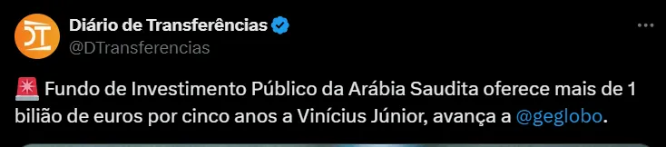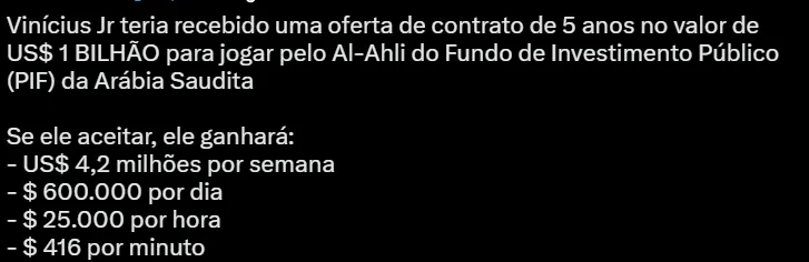 Uma ida ao Real Madrid só poderia acontecer diante de uma saída de Vinicius Júnior, que é forte alvo do mercado saudita. O camisa 9 está ciente e aguarda por essa oportunidade, mas sabe que o camisa 7 merengue não tem planos de deixar a capital espanhola tão cedo, o que afasta um acordo que seria histórico.