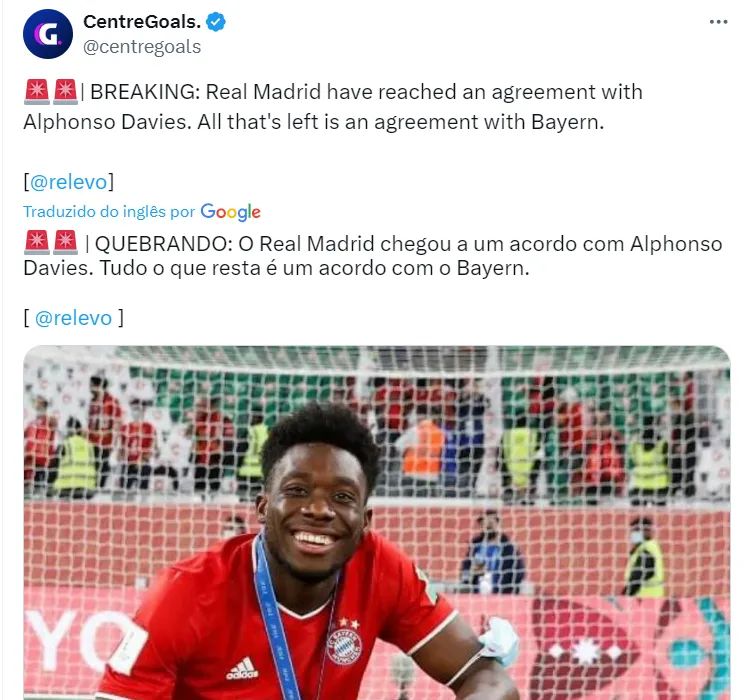 Davies é avaliado em 70 milhões de euros e seu contrato com o clube da Alemanha vai até o ano de 2025. O Bayern, inclusive, busca renovar com o jogador, mas o destino tende a ser Madri.