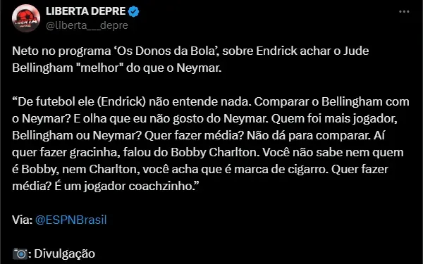 O ídolo dispara: “De futebol ele (Endrick) não entende nada. Comparar o Bellingham com o Neymar? E olha que eu não gosto do Neymar. Quem foi mais jogador, Bellingham ou Neymar?”, disse.