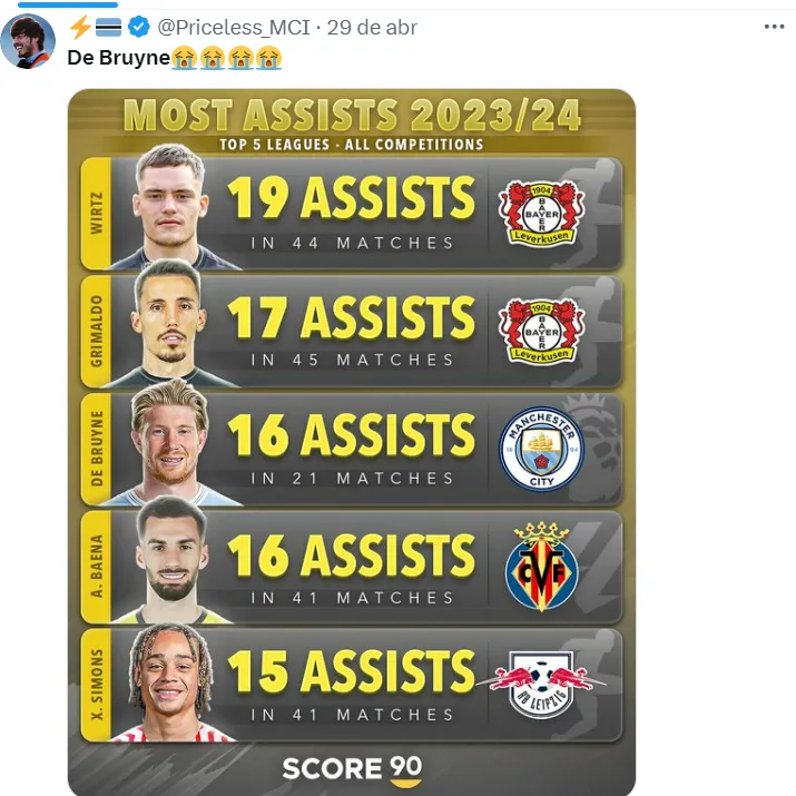 De Bruyne tem contrato com o Manchester City válido até julho de 2025. No final da atual temporada, ele vai entrar em seu último ano de contrato, o que acaba deixando os ingleses preocupados.