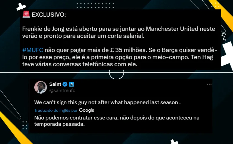 Informações do portal inglês ManchesterUnitedForever dão conta que o clube de Old Trafford recebeu o ‘sim’ de De Jong e, agora, vai prosseguir nas conversas com o Barcelona por um acordo. Ainda segundo a matéria, o jogador concordou em diminuir seu salário para entrar no padrão financeiro do clube da Inglaterra.