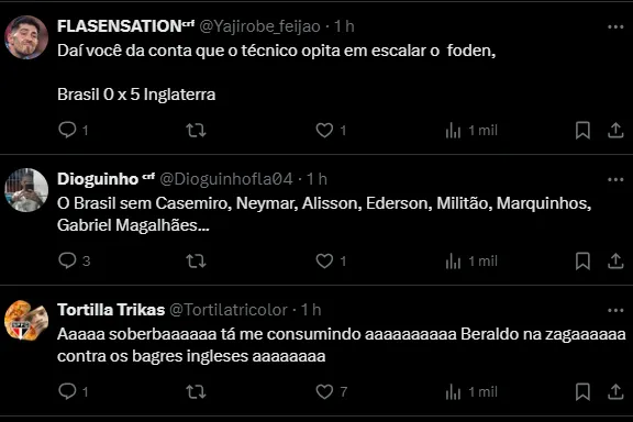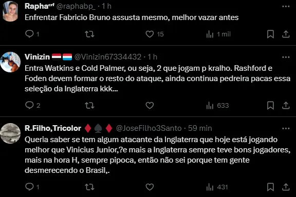 A publicação lembra ainda de Jarrod Bowen, James Maddison, Cole Palmer e Anthony Gordon, que está convocado pela primeira vez na carreira profissional até o momento.