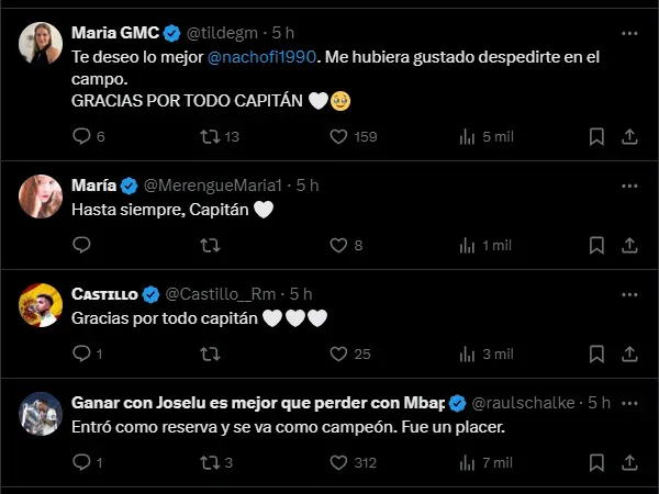 “O Real Madrid anuncia que o nosso capitão Nacho decidiu encerrar a carreira como jogador do Real Madrid. Queremos expressar a sua gratidão e carinho a Nacho, uma das grandes lendas do nosso clube”, destacou a equipe.