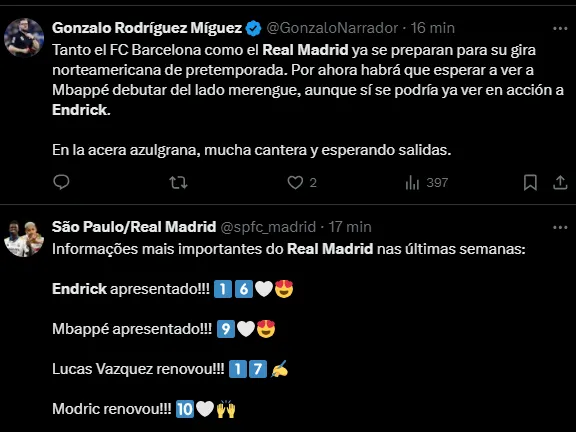 Mbappé não é o único e divide o protagonismo com o novo camisa 16 da equipe merengue. Vale lembrar que o ex-Palmeiras foi apresentado no Santiago Bernabéu para mais de 45 mil pessoas.