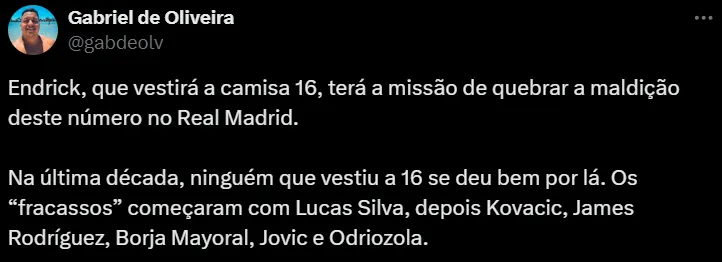 Apesar de toda essa maldição, torcedores Brancos acreditam que Endrick se dará bem na capital espanhola. Inclusive, eles confiam que o jogador teve muita coragem ao escolher esse número que seria “amaldiçoado”.