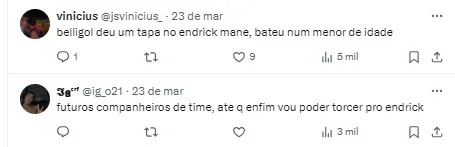 Bellingham cumprimentou o garoto e deu um “tapa” no rosto do brasileiro, de forma descontraída, já deixando no ar uma certa relação próxima entre os dois.