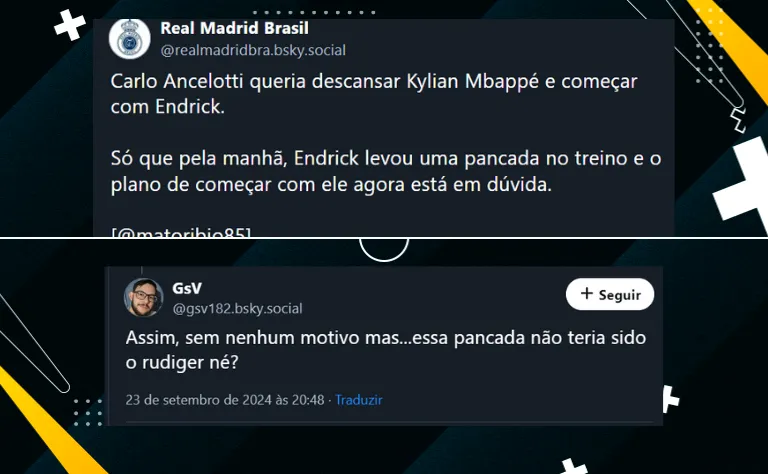 O Marca trouxe a provável escalação do Real Madrid para o confronto. Na frente, será o mesmo trio: Rodrygo, Mbappé e Vinicius Jr. A grande mudança está no meio, com Guler ganhando uma vaga. O possível time: Courtois; Lucas Vazquez, Rudiger, Militão e Mendy; Valverde, Tchouaméni e Guler; Vini, Mbappé e Rodrygo.