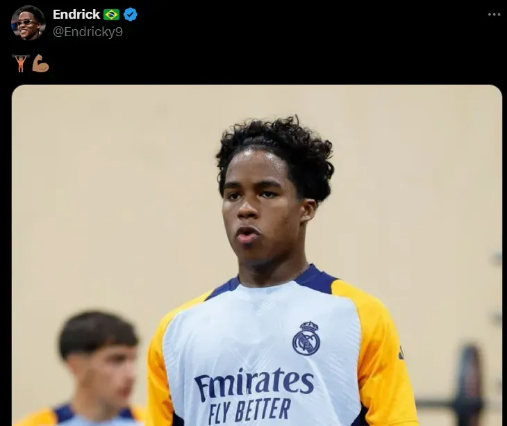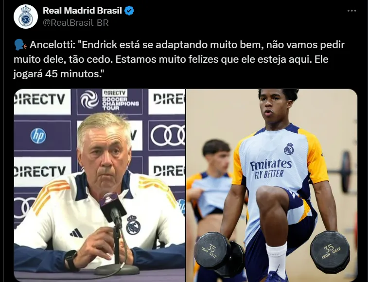 Endrick já deixou o Brasil e foi apresentado como novo reforço do Real Madrid. Ele treina com o grupo de Carlo Ancelotti e, inclusive, será titular pela primeira vez vestindo as cores merengue, em amistoso contra o Milan.