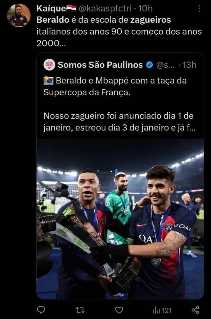 Beraldo tem tudo para valorizar ainda mais, principalmente com a estreia que vem viralizando nas redes socias. O defensor de apenas 20 anos recebeu o troféu, nada menos do que das mãos de Kylian Mbappé.