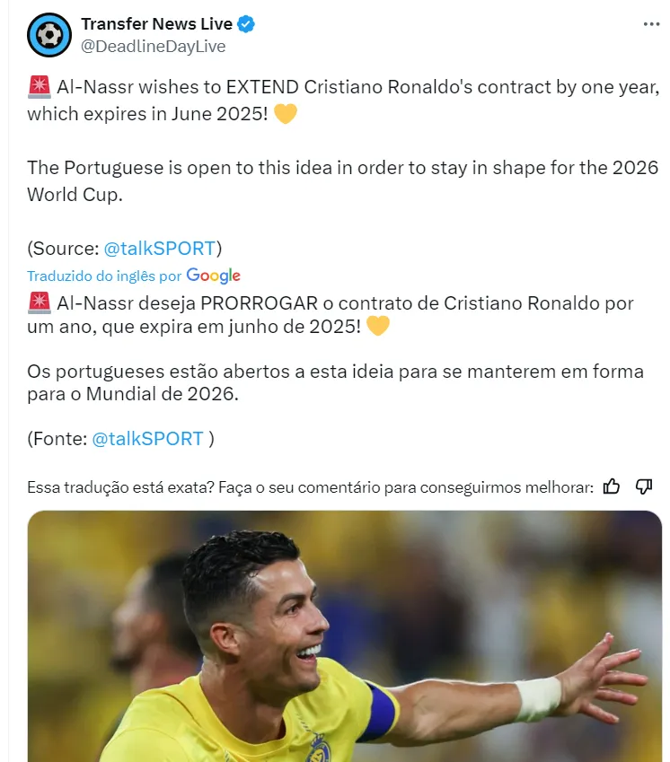 Segundo informações do Talk Sport, Cristiano Ronaldo deve renovar seu contrato com o Al-Nassr até a temporada de 2026. O Al-Nassr também deseja prorrogar o contrato do jogador para a disputa do Mundial.