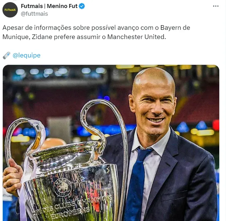 Zidane para o Bayern não deve acontecer, já que o francês prefere assumir o comando do Manchester United na próxima temporada, conforme informações do jornal L’equipe.