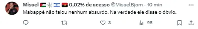 “Não pode falar do futebol sul-americano, que tem não sei quantos mundiais. O que Mbappé tem que falar? para mim é um grande jogador, que vai ganhar 34 bolas de ouro, mas tem que segurar a língua dentro da boca. Creio que o futebol sul-americano é referência. Temos jogadores que sabem jogar futebol futebol e marcar. por sorte não tive ocasião de jogar contra ele, não sei se sorte para mim ou para ele”, finalizou.