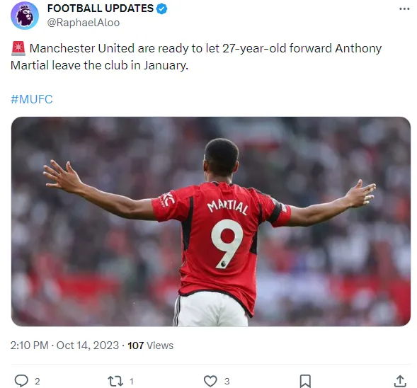 De acordo com a fonte, o atacante francês não está mais nos planos da equipe e provavelmente será negociado em janeiro, uma vez que não conseguiu impressionar Ten Hag.