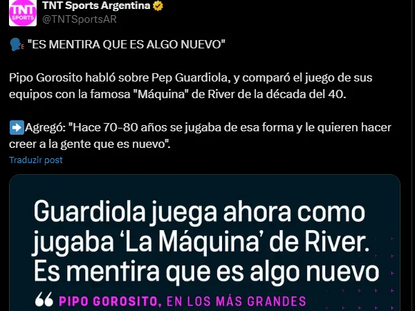 Pipo Gorosito considera que o River Plate já jogava como o Manchester City atua hoje, em 1940. O ex-atleta deu o discurso conforme trazido pela TNT Sports Argentina.
