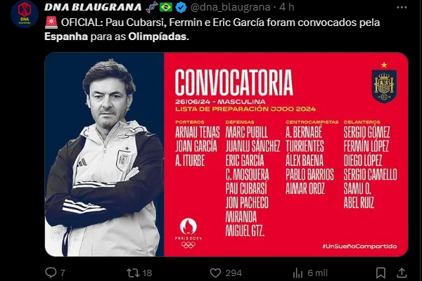 Jovens do Barça e campeão da Premier League pelo City estão na lista espanhola para a disputa dos Jogos Olímpicos de Paris, que o Brasil está fora. A Seleção Brasileira não conseguiu a classificação.
