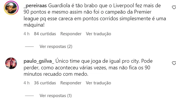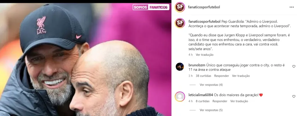 “Quando eu disse que Klopp e Liverpool sempre foram, é isso, é o time que nos enfrentou, o verdadeiro, o verdadeiro candidato que nos enfrentou cara a cara, que enfrenta você, seis/sete anos”, disse Guardiola.